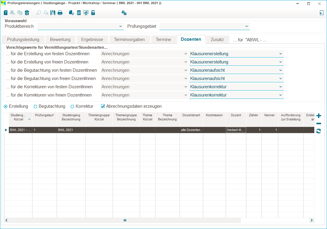 Auf der Registerkarte Dozenten legen Sie die Anrechnungstatbestände für die Erstellung, die Begutachtung und die Korrektur von Prüfungsleistungen fest.