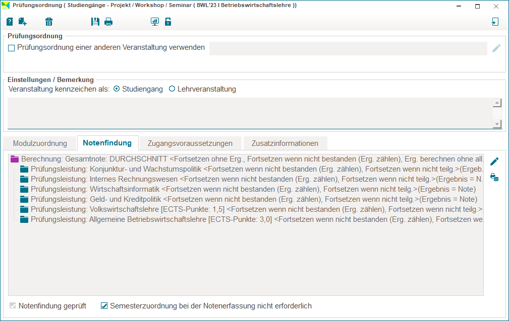 Das Fenster Prüfungsordnung öffnen Sie über das Veranstaltungsfenster ➔ Menüexplorer Prüfungsverwaltung ➔ Prüfungsverwaltung.