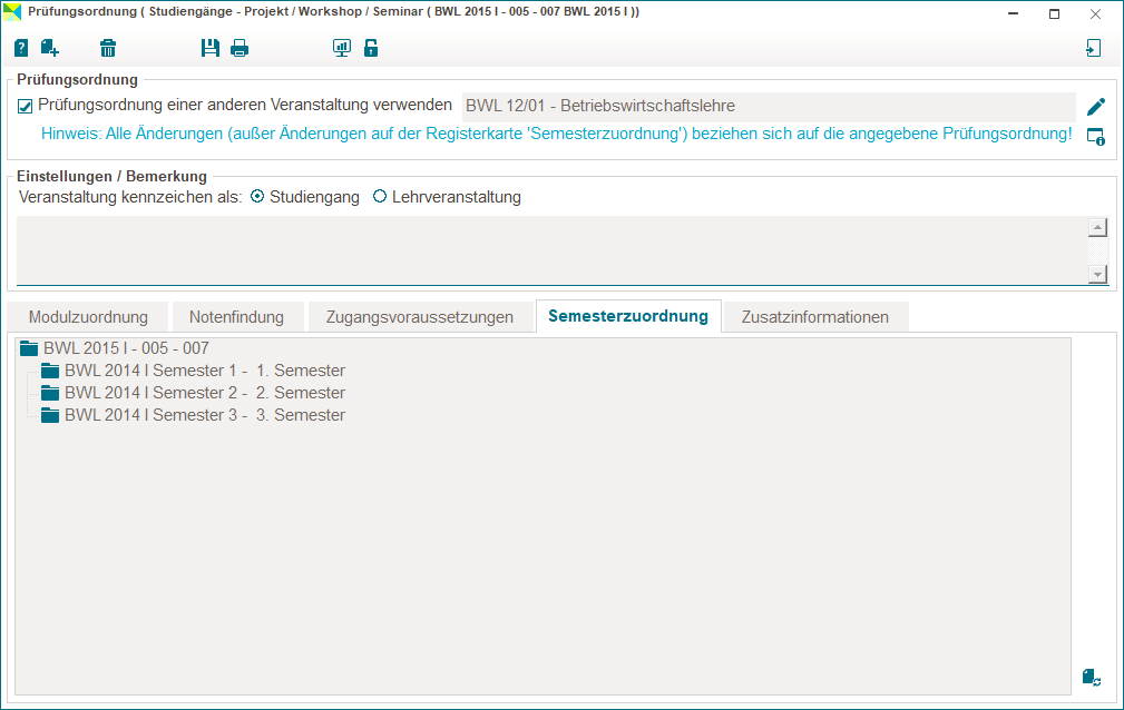 Fenster Prüfungsordnung Registerkarte Semesterzuordnung