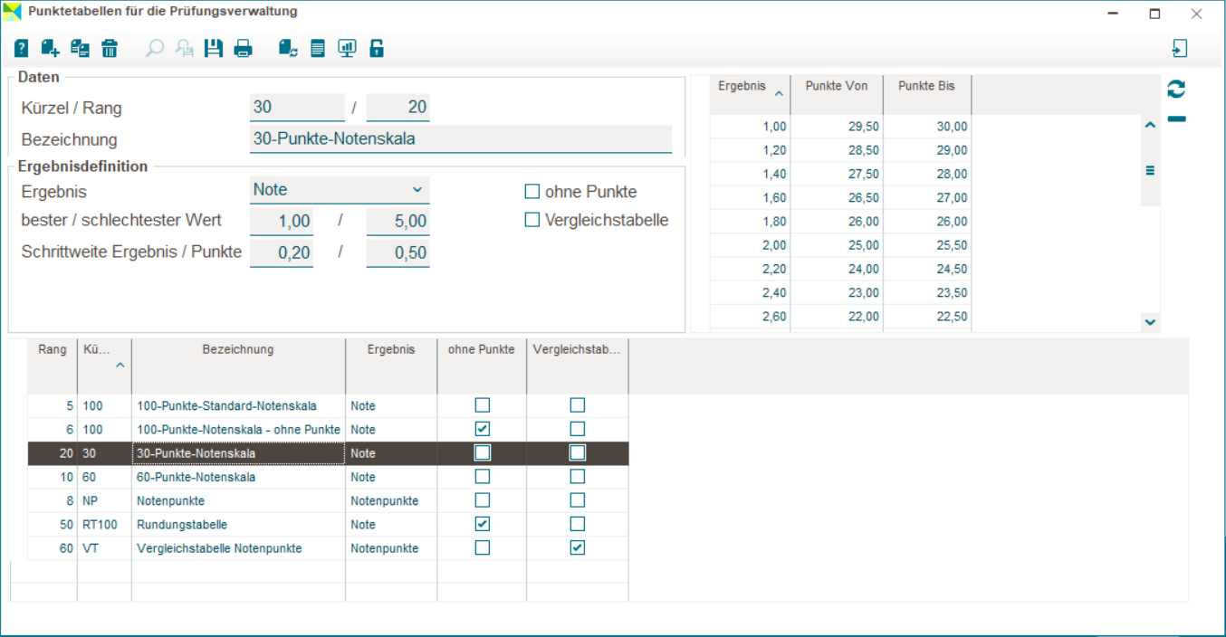 Im Fenster Notenfindung für die Prüfungsordnung können Sie die Punktetabellen nutzen.