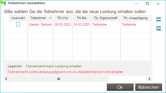 14. Setzen Sie bei den Teilnehmern, welche die Leistung bekommen sollen, das Kennzeichen Auswahl.