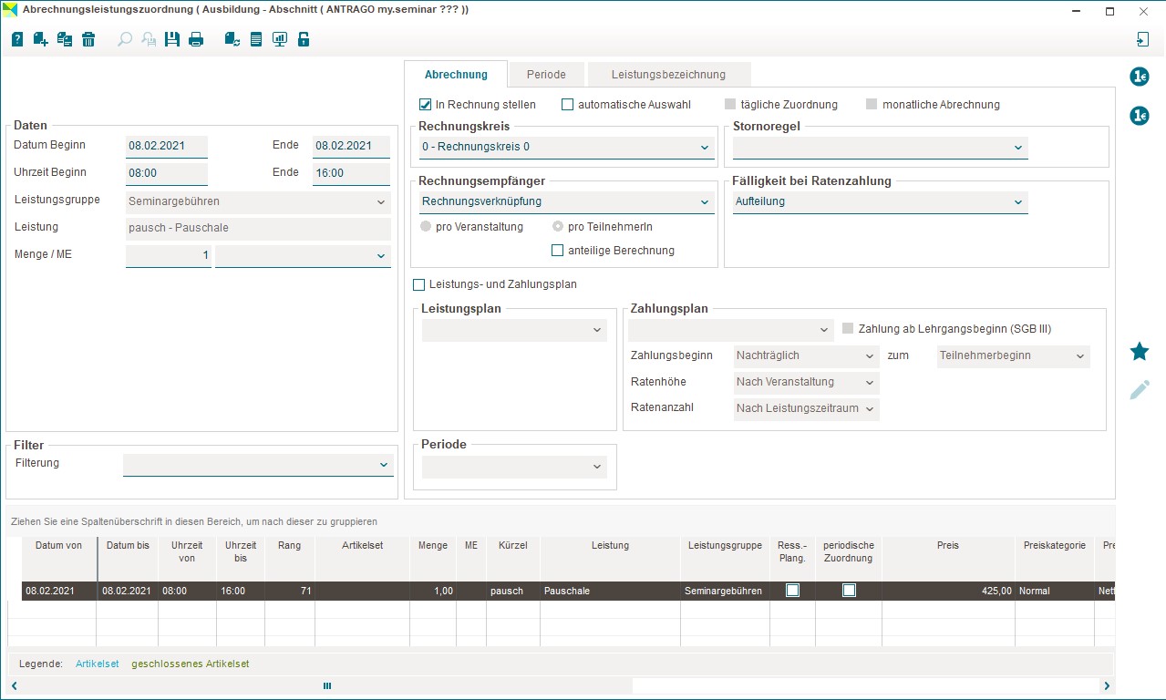 • Die Leistungsgruppe und die Leistung wurden in den Basisdaten angelegt.