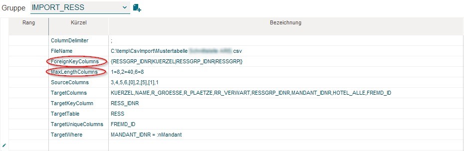 ForeinKeyColumns - Sie können beim Import von Daten einen Fremdschlüssel ermitteln lassen, um die Daten zweier Datenbanktabellen miteinander zu verknüpfen. Dies ist zum Beispiel dann nötig, wenn Sie für die Basisdaten Ressourcengruppen und zugehörige Ressourcen importieren. Hierbei muss die Ressource über die ID der Ressourcengruppe miteinander verbunden werden, um die Ressource der Ressourcengruppe zuzuweisen.