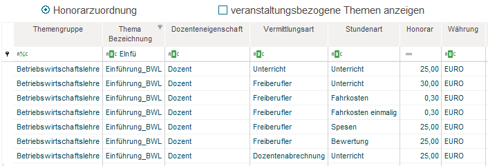 Wird ein Dozent mit einem individuellen Honorar für ein Thema und eine bestimmte Vermittlungsart/Stundenart abgerechnet, so wird das hier hinterlegte Honorar herangezogen.