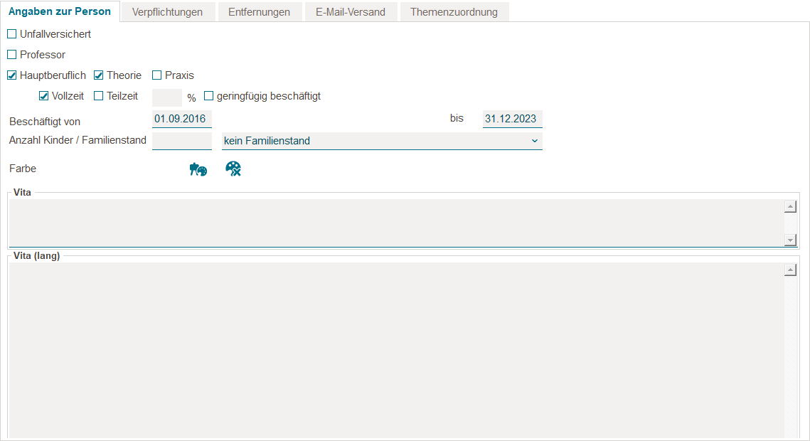Auf der Registerkarte Angaben zur Person hinterlegen Sie personenbezogene Daten des Dozenten.