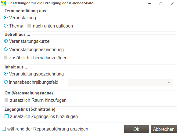 Im Einstellungsfenster der Reportprozedur können Sie den Inhalt des Termins konfigurieren. Sind für den Teilnehmer bzw. Dozenten mehrere Termine vorhanden, enthält die iCalendar-Datei mehrere Termine.